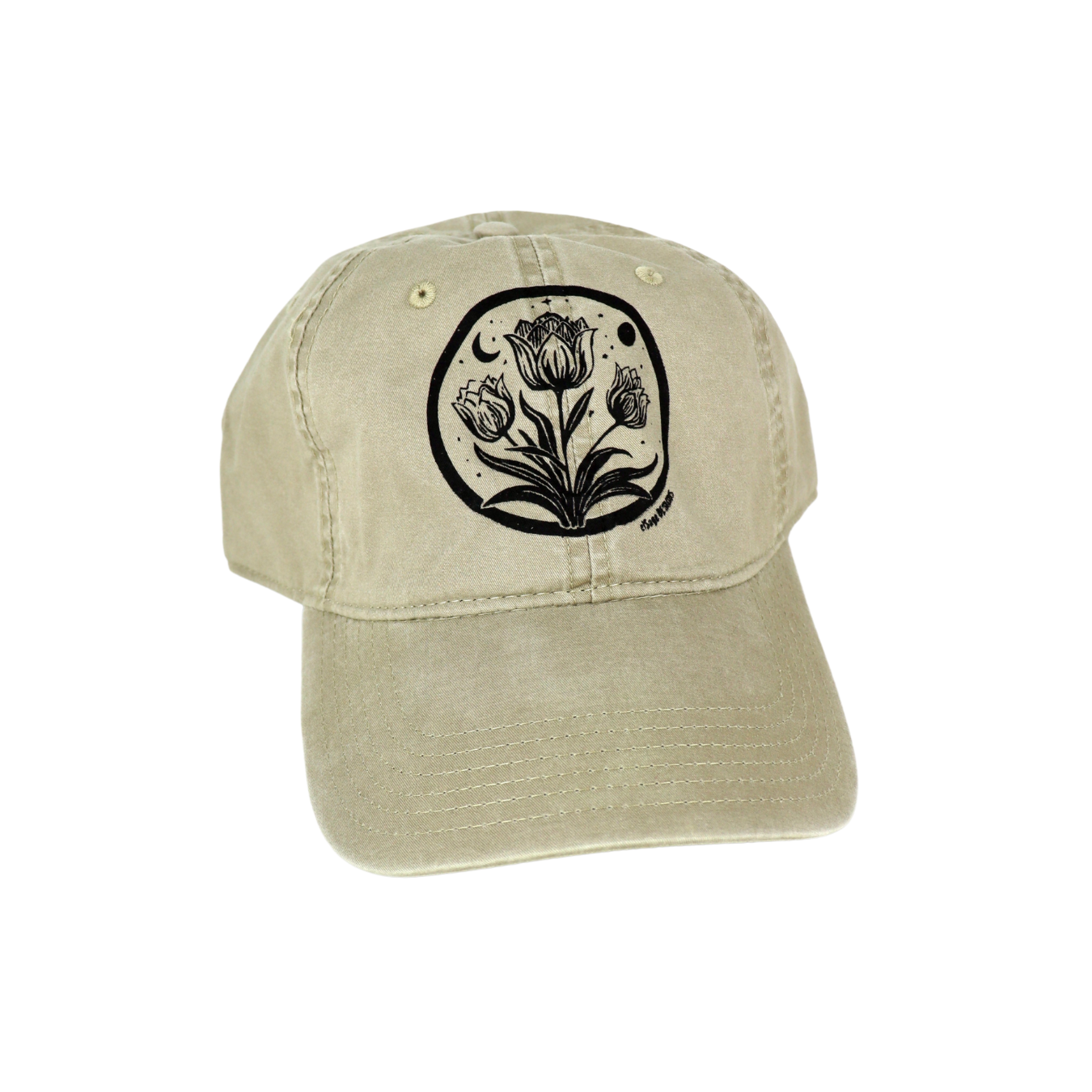 Our Tulip Moon design is printed entirely printed by hand with organic, water-based ink on a classic Dad hat.